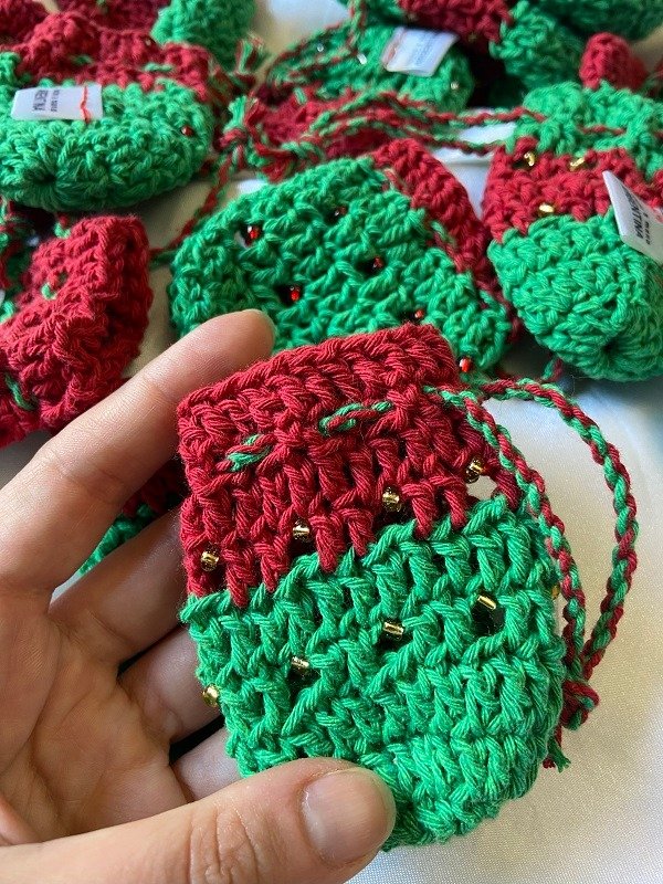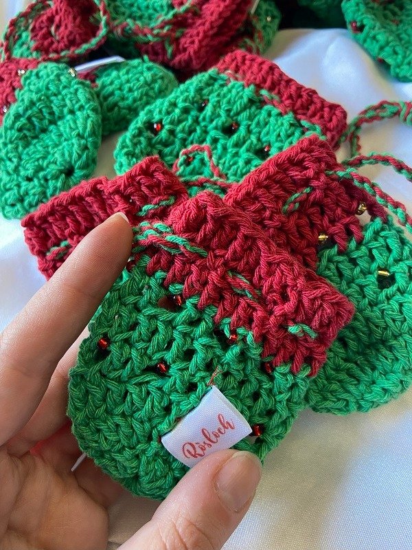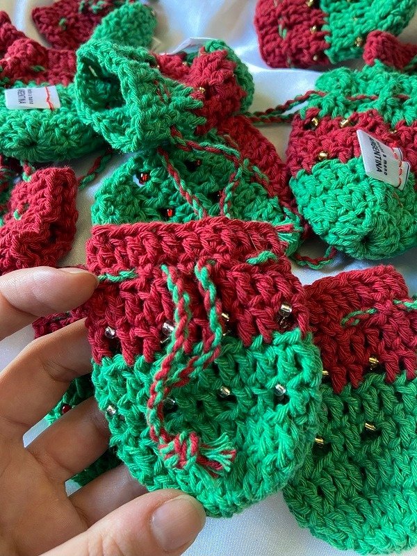 Bolsita tejida en hilo al crochet en colores verde y rojo con incrustación de mostacillas!