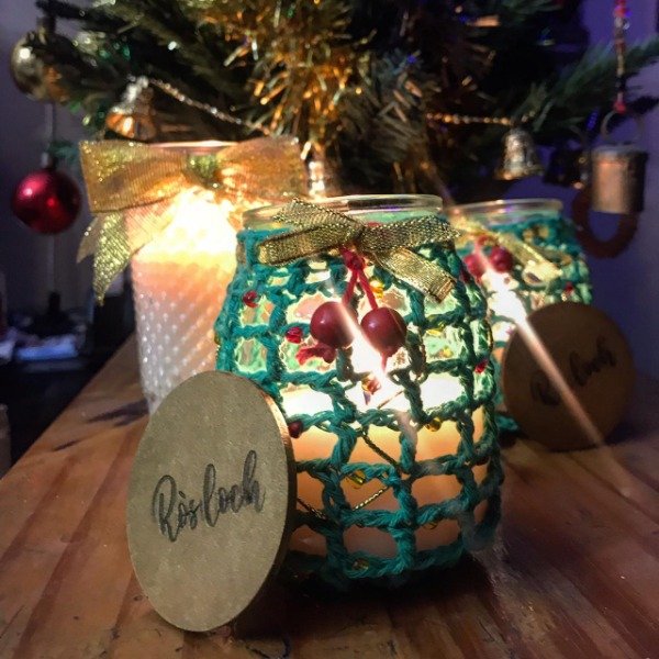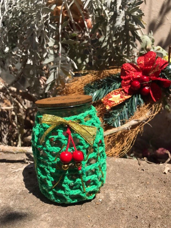 Este potiche tiene una vestimenta tejida al crochet en color verde Navidad, con incrustaciones